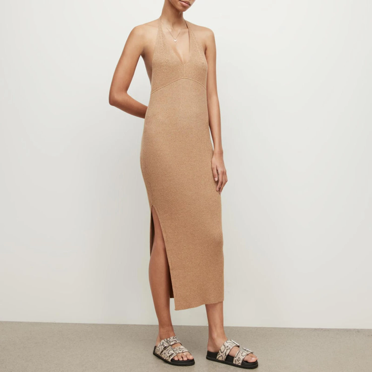 AllSaints Camel Lexi Halter Neck Cotton Dress