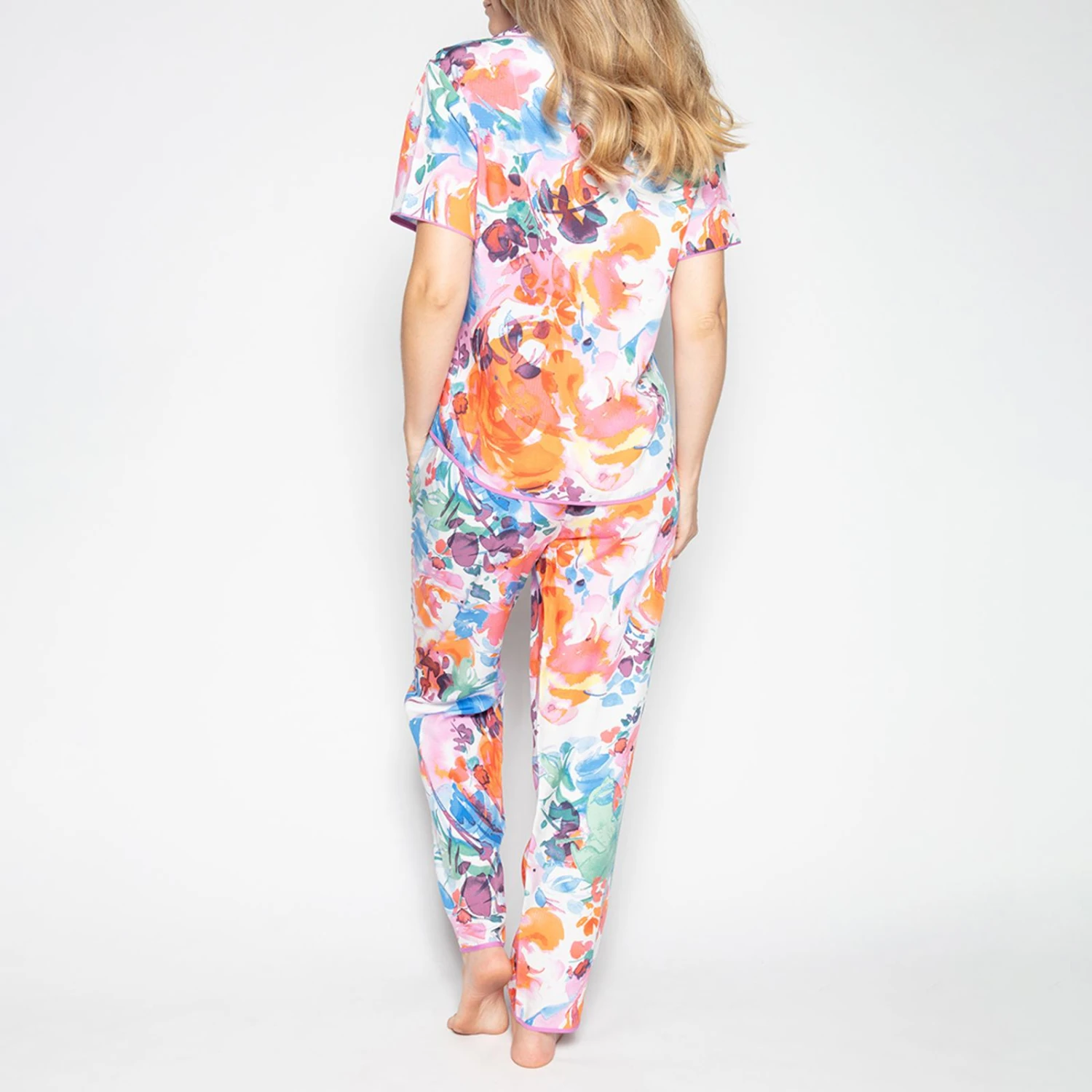 - The top has an open collar and fastens at the front with dusky pink buttons.