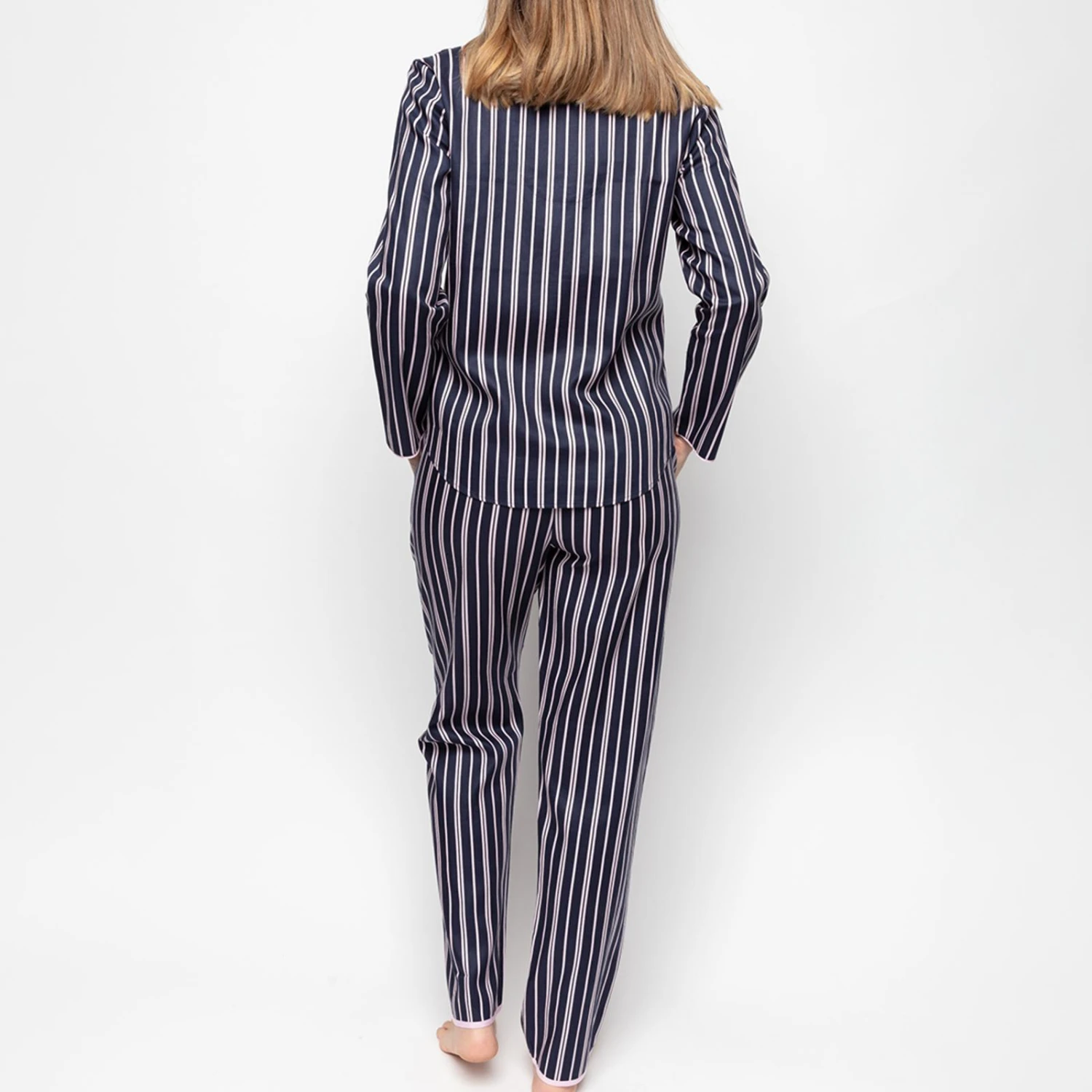 - The long-sleeved top has an open collar and fastens with pale pink, modal-covered buttons.