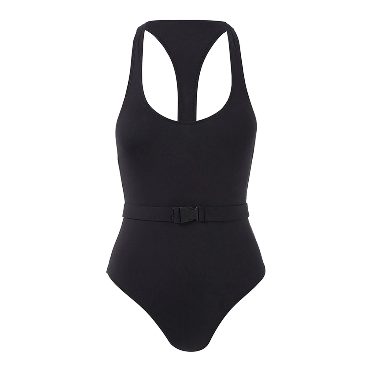 - A belted waist with a clasp fastening adds to its streamlined shape, making it a chic choice for days spent riding the waves
