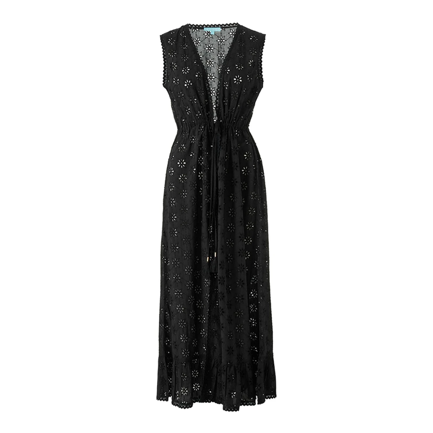 - A slim tie at the waist is adorned with delicate tassel details and is designed to be worn open or belted as you prefer.