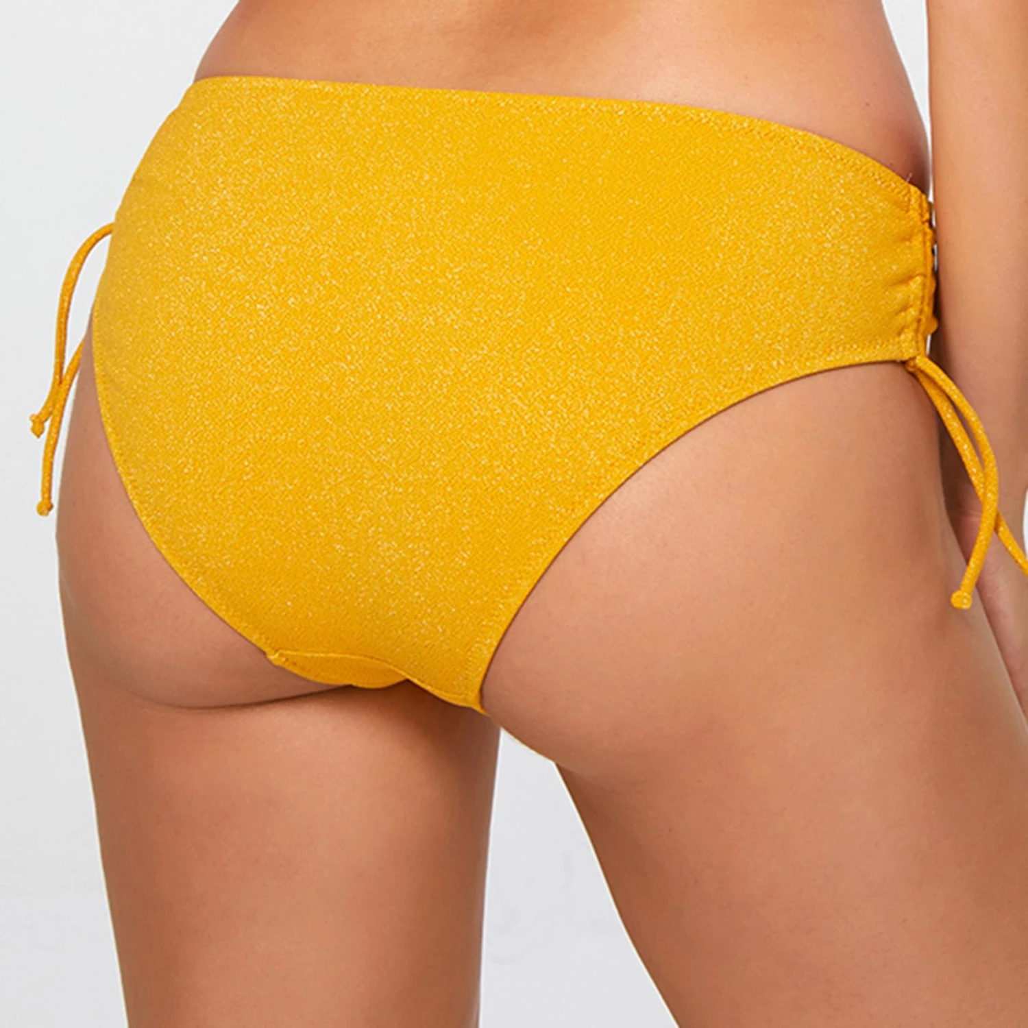 - Ruched adjustable tie side detail.