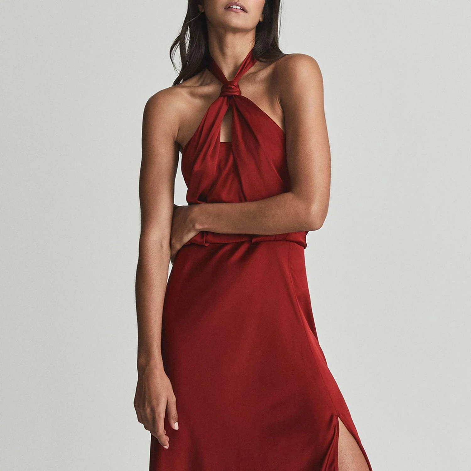 Reiss Red Lorena Halter Neckline Satin Midi Dress