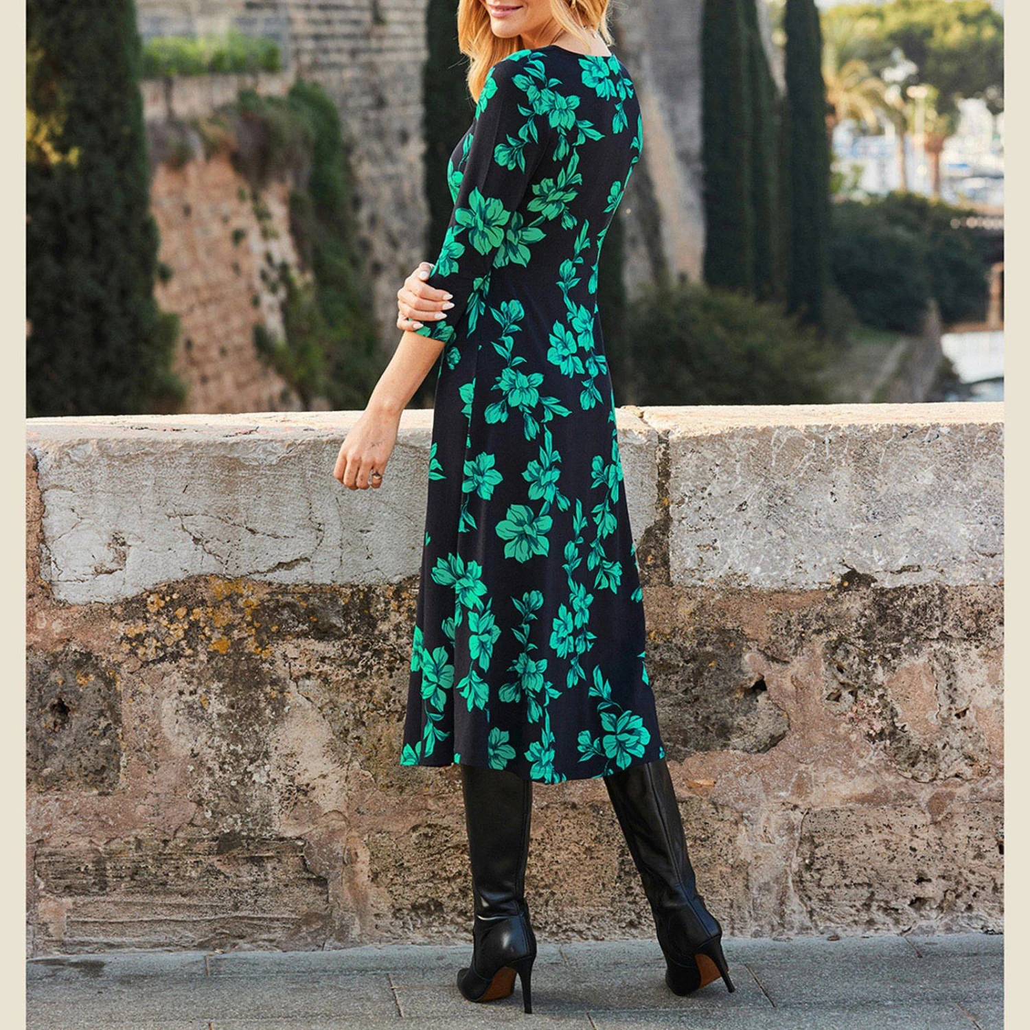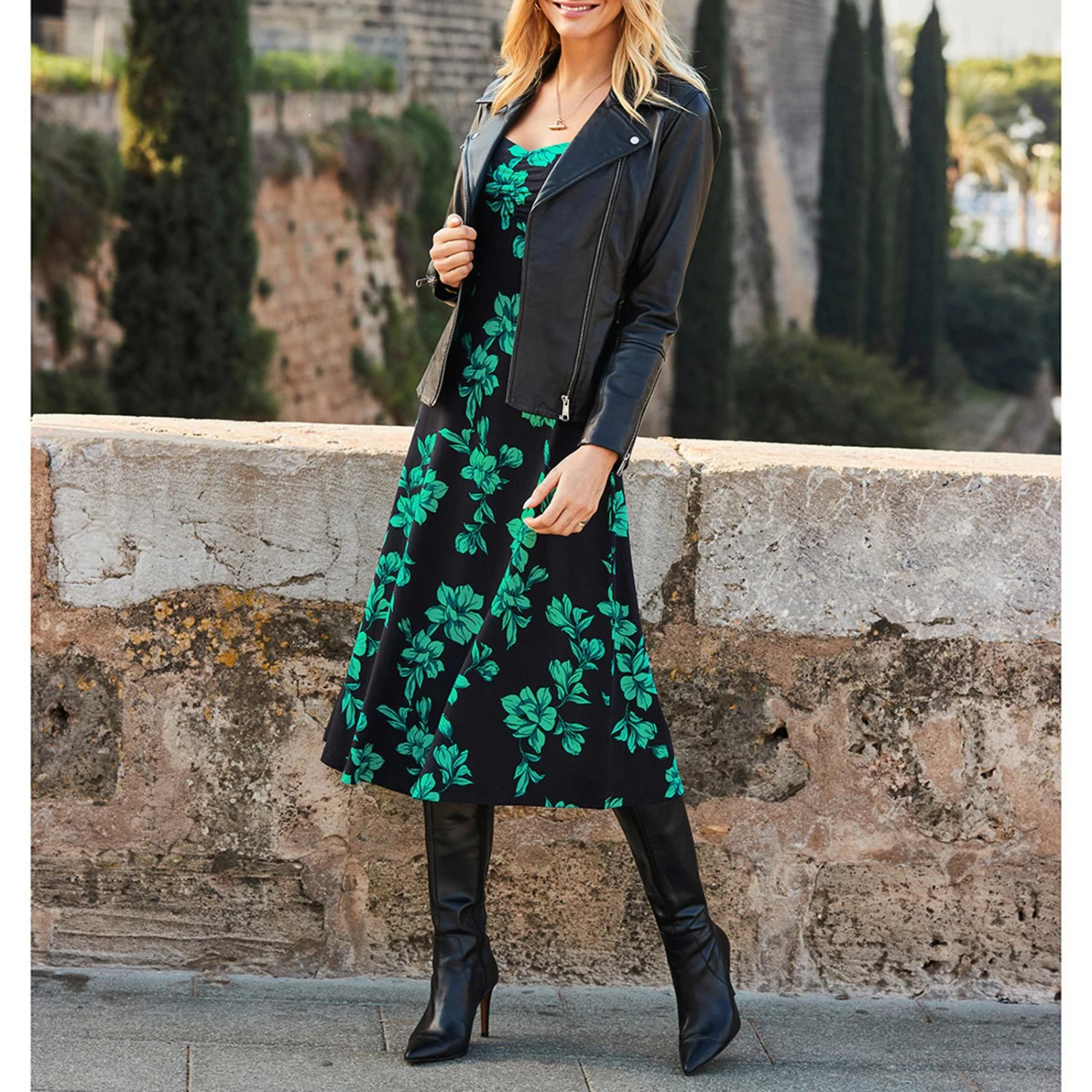 SOSANDAR Black/Green Floral Print Midi Dress