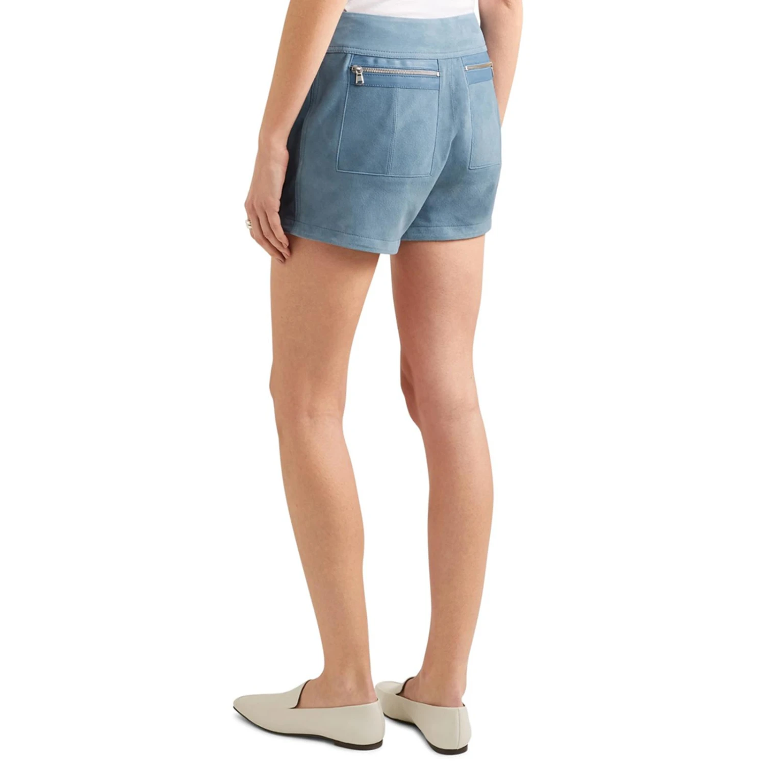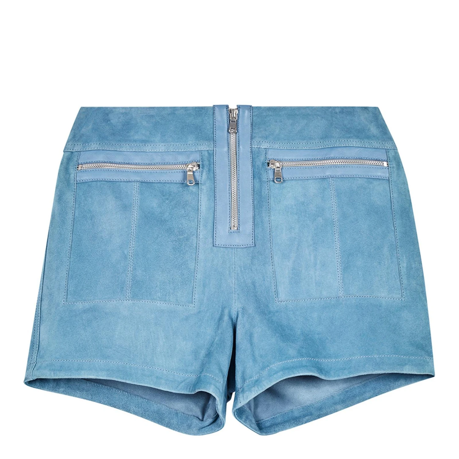 - Soft suede shorts in cornflower blue with two pockets and hidden zip closure. Pair with a simple shirt or t-shirt.