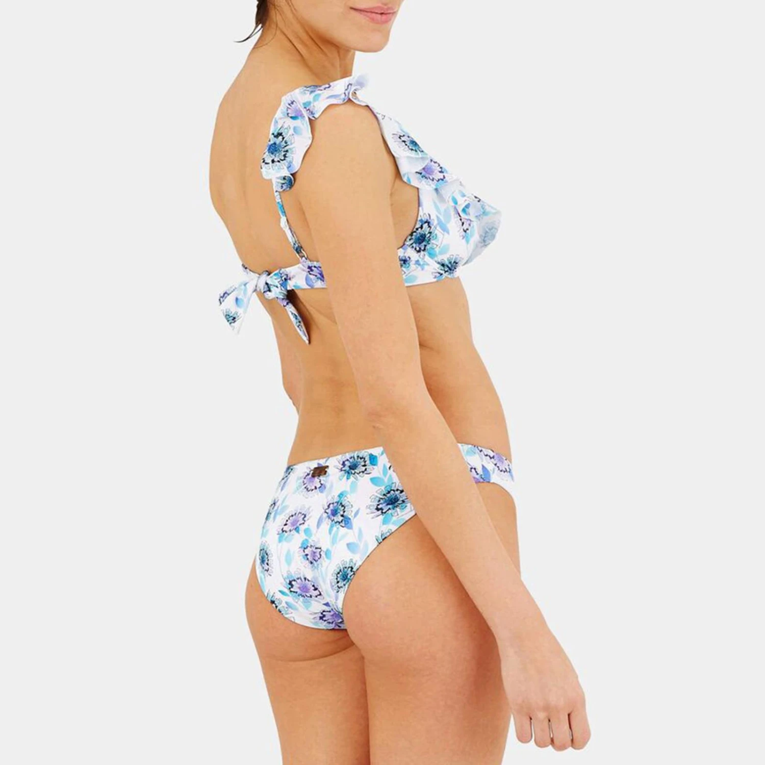 - Blue floral patterns cover this women’s underwired but cupless bikini top.