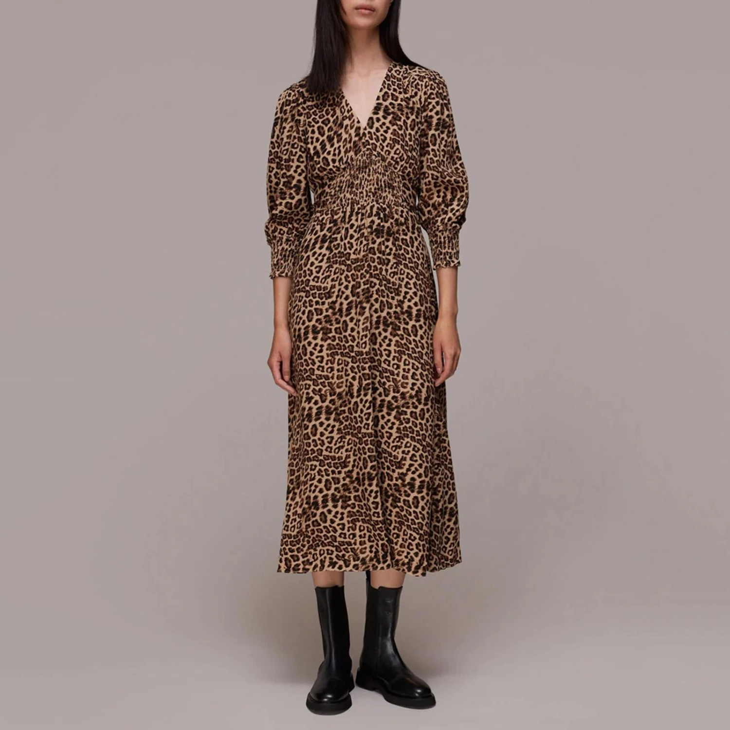 WHISTLES Brown Animal Print Shirred Midi Dress